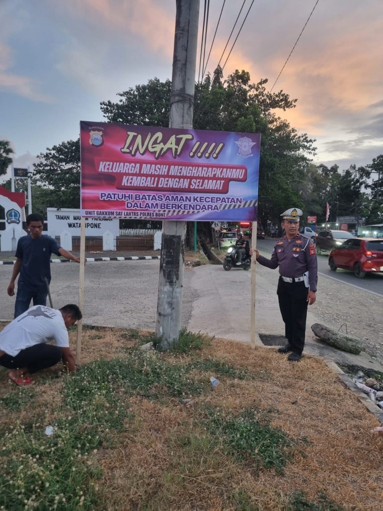 Spanduk bertuliskan “Ingat, Keluarga Masih Mengharapkanmu Kembali Dengan Selamat, Patuhi Batas Aman Kecepatan Dalam Berkendara.” Dipasang di Jalan Jend Sudirman – Jalan Andi Malla, Kelurahan Biru, Kabupaten Bone.
