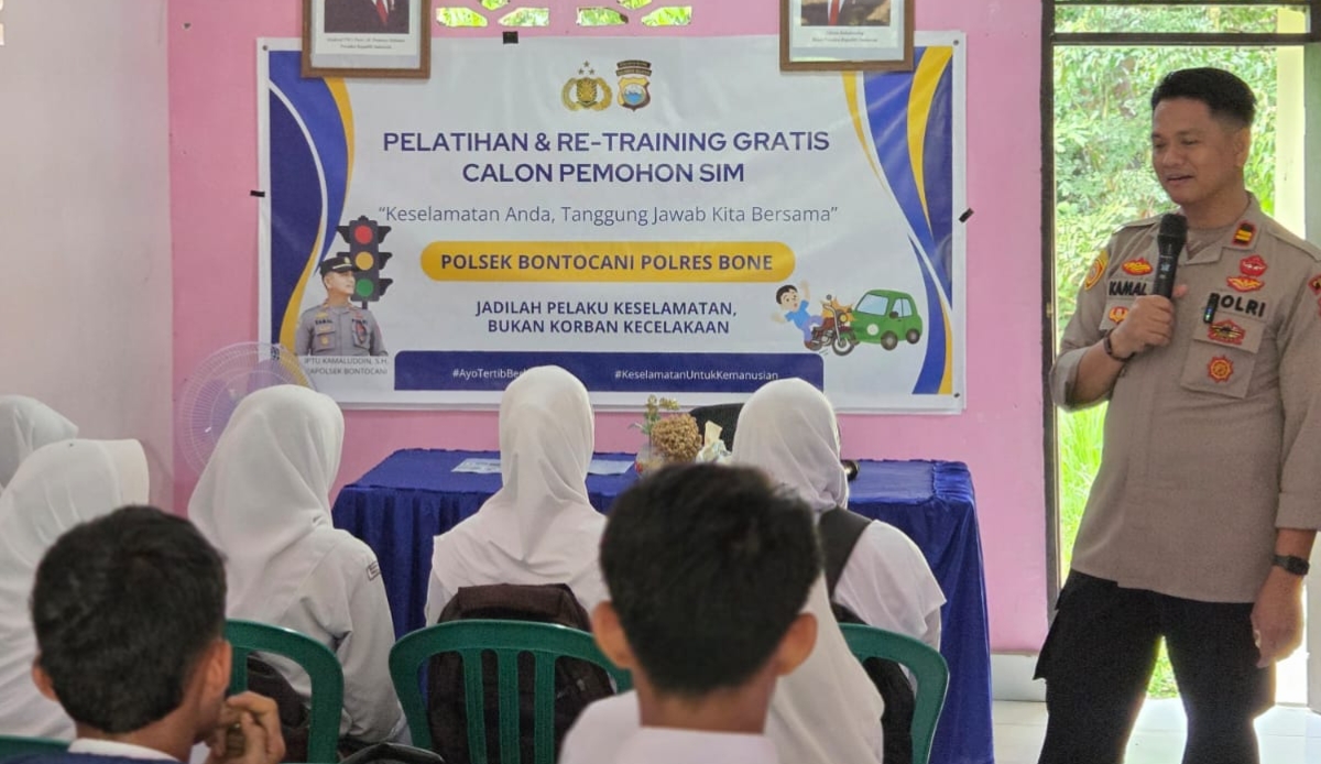 BONE– Personel Polsek Bontocani, Kecamatan Bontocani, Kabupaten Bone Bolango, terus menggelar kampanye edukasi keselamatan dan etika berkendara untuk seluruh masyarakat, khususnya pelajar yang akan memasuki usia 17 tahun sebagai calon pemohon Surat Izin Mengemudi (SIM).