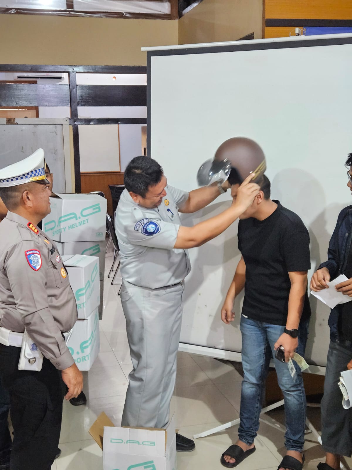 Selain pembagian helm, petugas juga memberikan sosialisasi singkat tentang aturan lalu lintas serta pentingnya melengkapi diri dengan perlengkapan keselamatan sebelum berkendara.