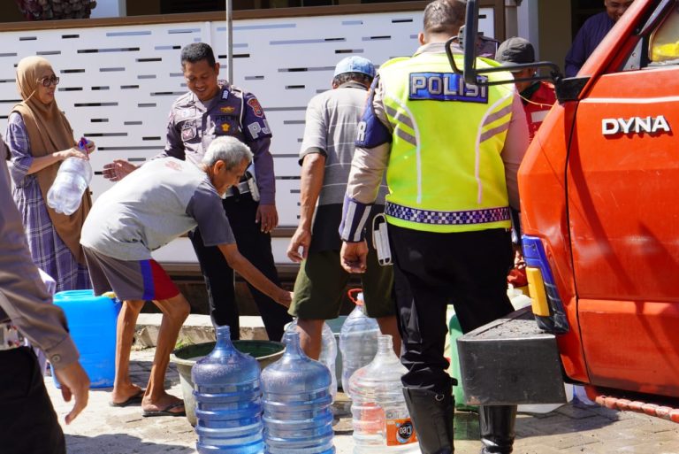 MAKASSAR– Personel Sat PJR Ditlantas Polda Sulsel melakukan bakti sosial membagikan atau distribusi air bersih ke warga di kawasan Kompleks NTI, Kecamatan Tamalanrea Kota Makassar, Kamis (30/8/23).