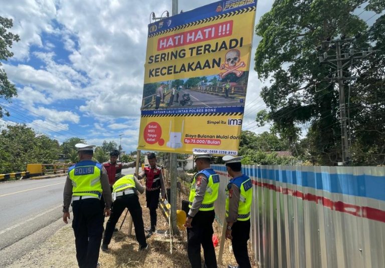 BONE – Dalam upaya untuk meningkatkan kesadaran dan kepatuhan masyarakat terhadap peraturan lalu lintas, Satlantas Polres Bone kembali melaksanakan kegiatan pemasangan spanduk imbauan pada titik Black Spot di Jalan Mt. Haryono, Macanang, Kabupaten Bone, Kamis (5/2/2026).