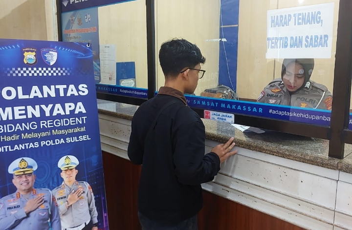 MAKASSAR– Ditlantas Polda Sulawesi Selatan tingkatkan  layanan Regident (surat kendaraan bermotor) di dengan program Polantas Menyapa di Samsat Makassar 1 di Jalan Andi Mappanyukki, Makassar, dengan konsep Polantas Mappatabe.