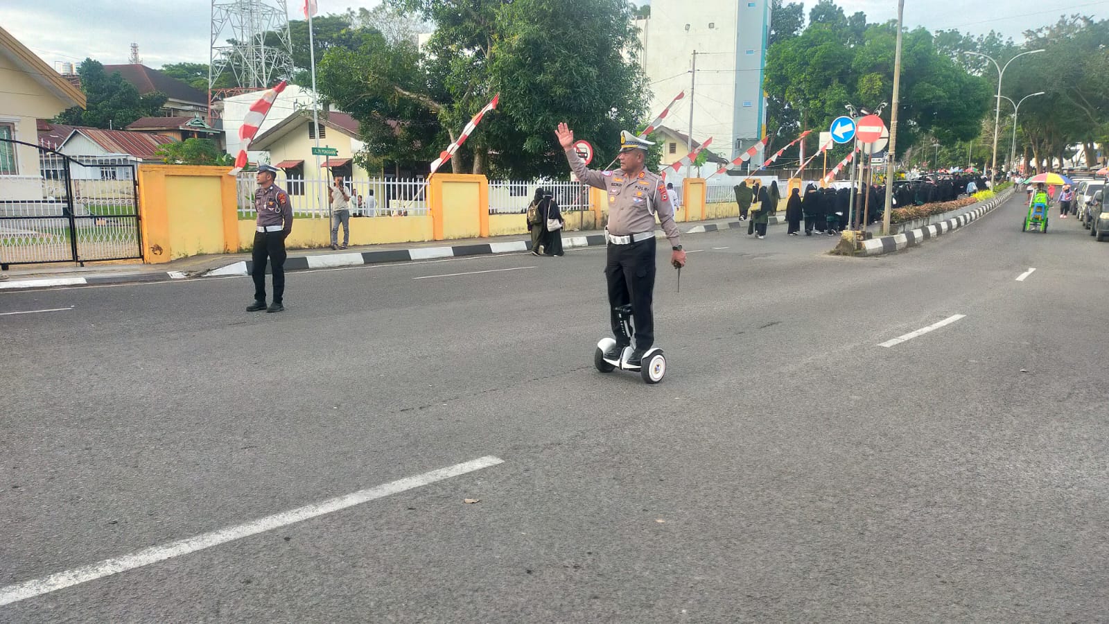 Personel tampak melakukan rekayasa lalu lintas secara situasional guna mengantisipasi kepadatan kendaraan dan menjamin keselamatan para peserta.