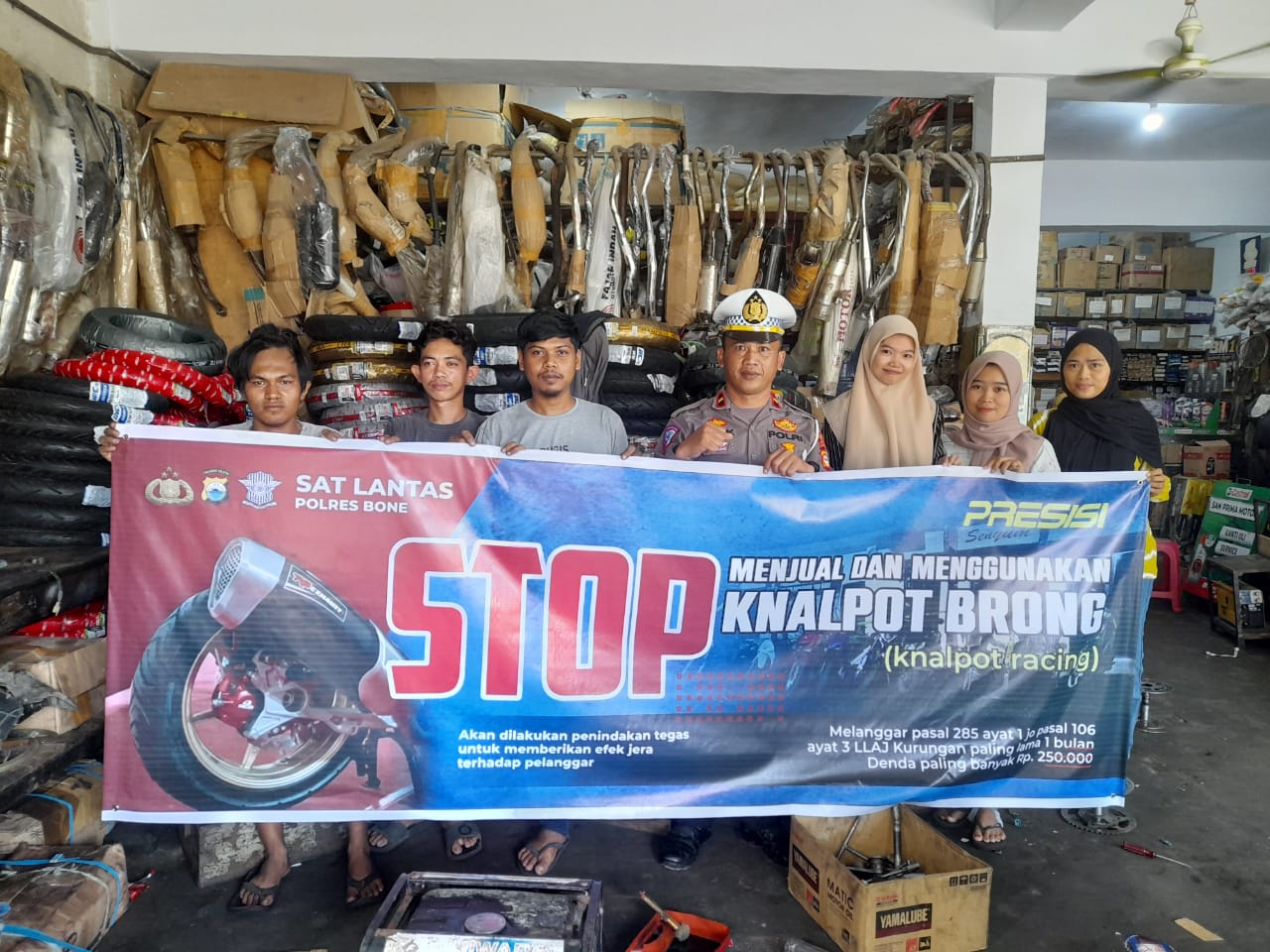 “Para pengusaha Bengkel diimbau untuk tidak menjual dan memasang knalpot brong kepada masyarakat. UULAJ Nomor 22/ 2009 Psl 285 (1) tentang persyaratan tehnis dan laik jalan yang tidak memenuhi Standar,” ujar Kapolres Bone AKBP Arief Doddy Suryawan melalui Kasat Lantas AKP Desy Ayu Dwi Putri.
